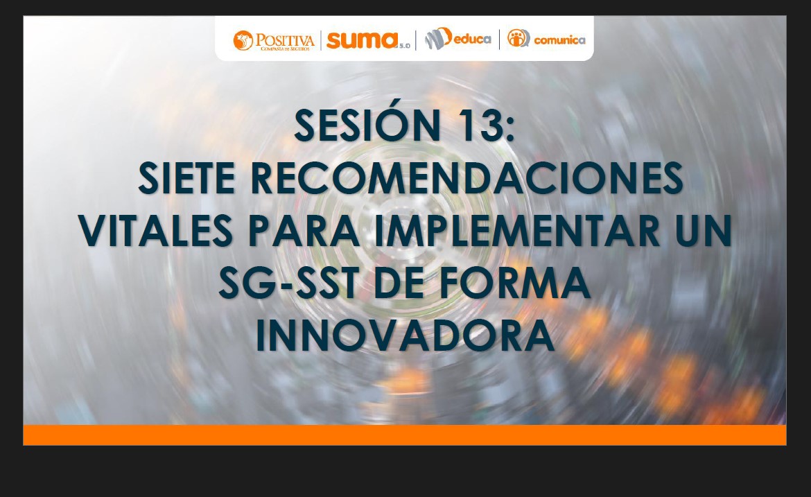 Posipedia > Comunidad nacional de conocimiento > Innovación y liderazgo en seguridad y salud en el trabajo > Sesión 13: Recomendaciones Vitales para una Implementación Innovadora del SG-SST – Fecha: noviembre 6, 2025 > 06.-PRESENTACION-SESION-13-SIETE-RECOMENDACIONES-VITALES-PORTADA